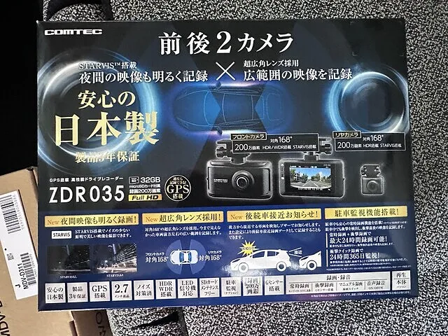 今回取り付けるのはコムテック製の前後2カメラタイプ。