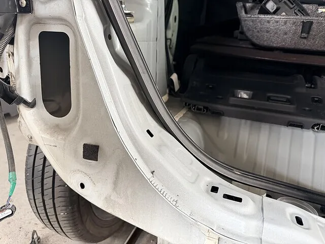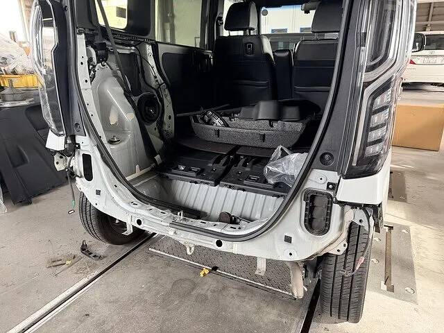 リア周りを取り外し、内側の骨格まで点検した結果、外板だけでなく一部パネルにも変形を確認。