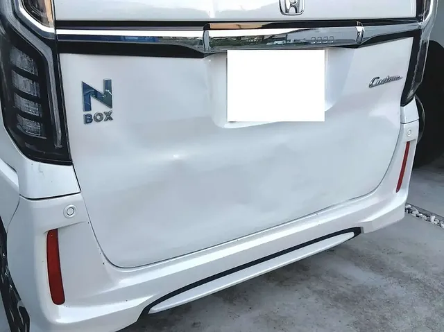 追突事故により、リアバンパーを中心にトランク周りまで歪みが生じ、テールランプ付近や内部パネルにも損傷が及んでいたN-BOX。