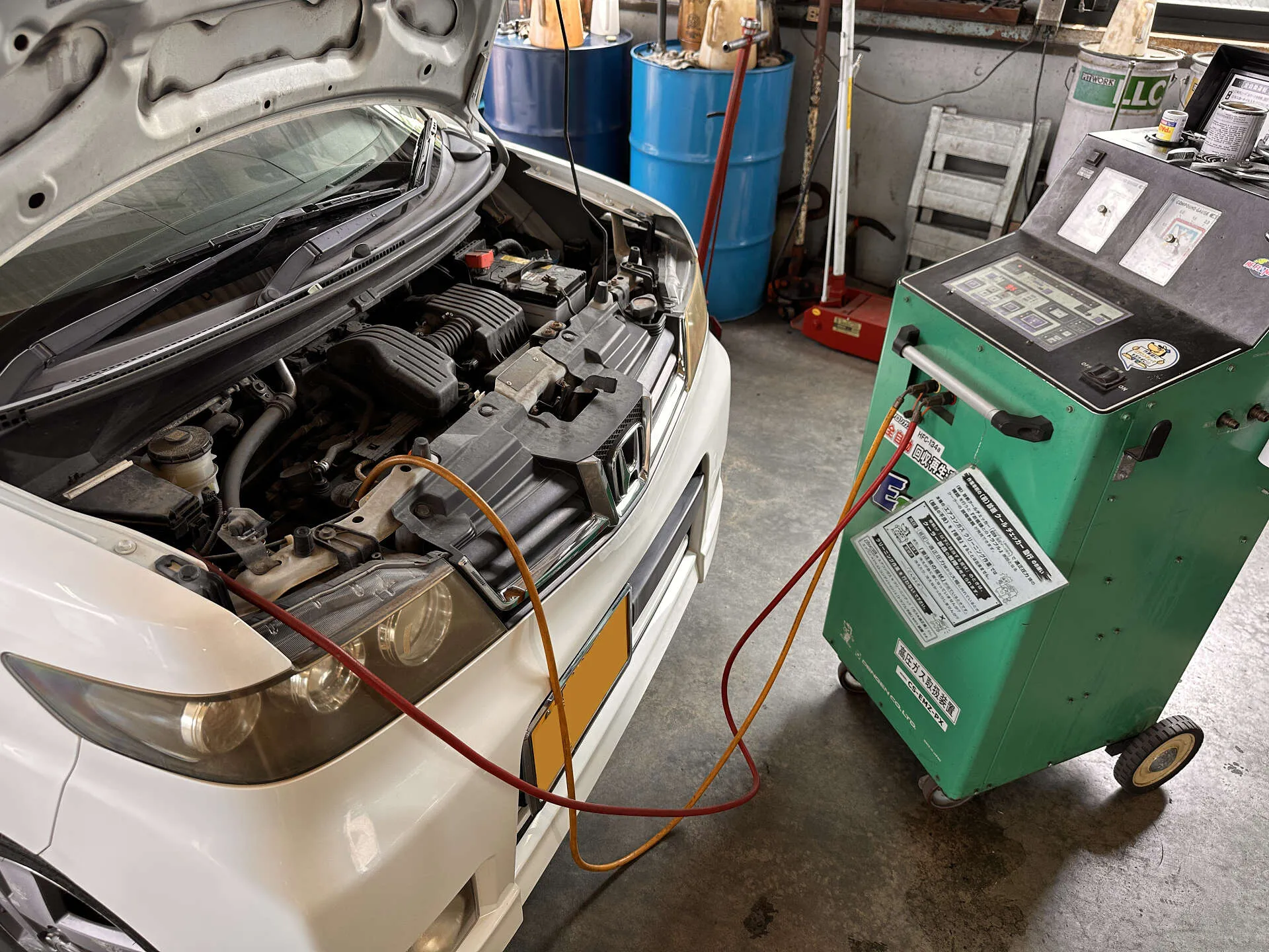 まず、専用のエアコンメンテナンス機器を使用し、残っていたエアコンガスをすべて回収。