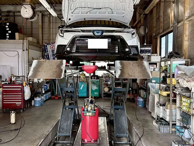 エンジンオイル交換にあたって、まずはリフトアップを行い、車両下部やオイル漏れの有無を点検。