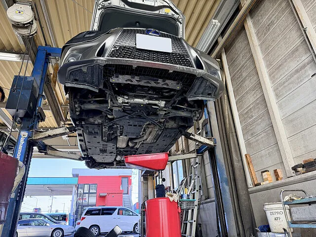 写真のようにリフトアップした状態で下まわりを確認しながら作業を進め、古くなったエンジンオイルをしっかり抜き取って新しいオイルへ交換。